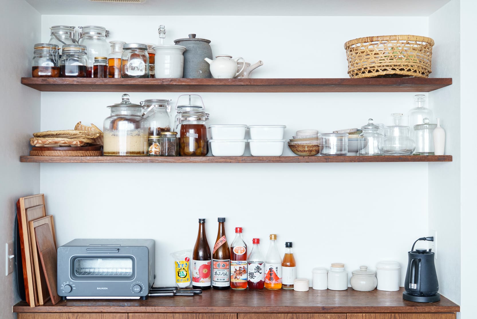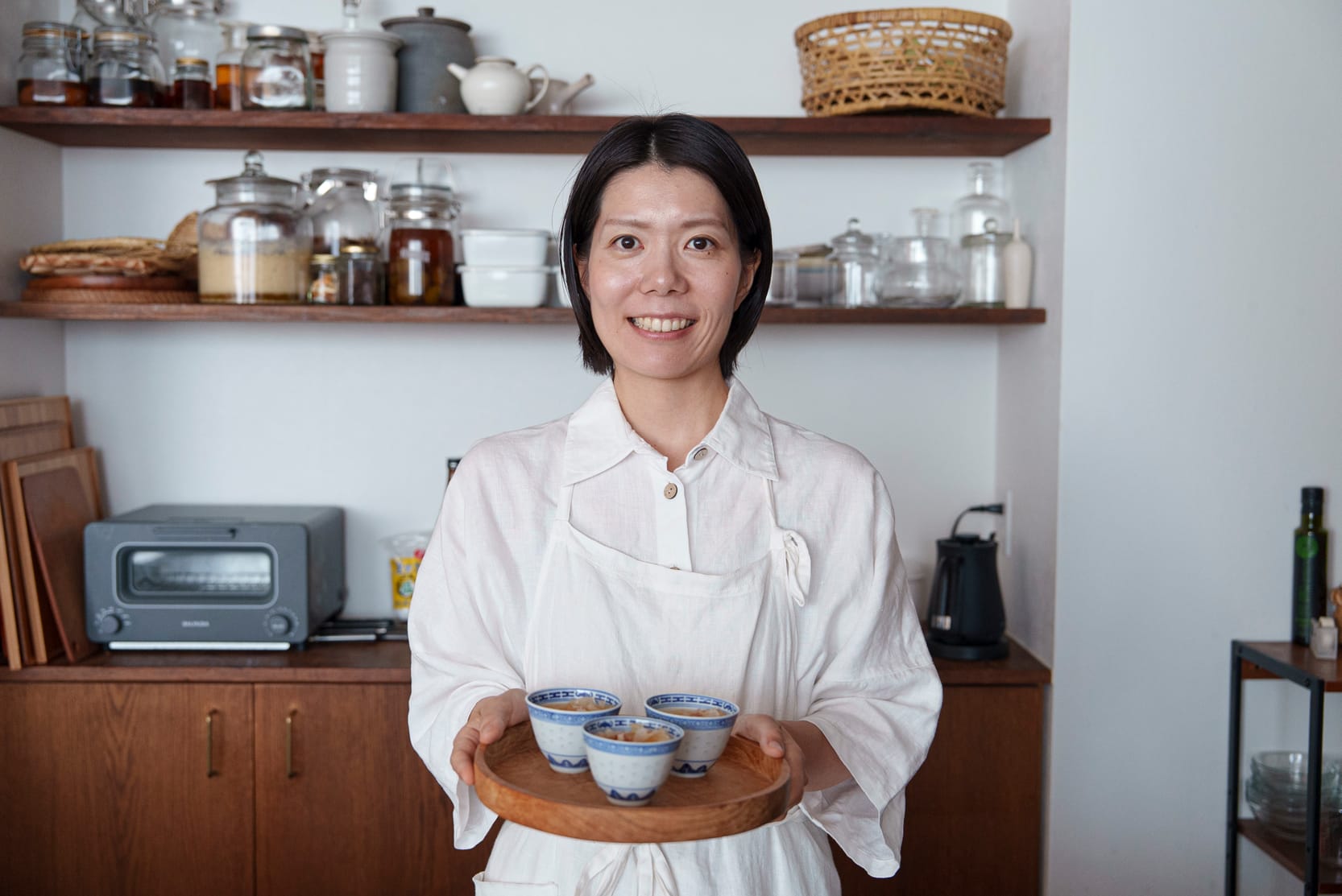 榎本さんのキッチンの棚には、大小さまざまな形の瓶がずらりと並んでいる。その中身の多くは、手づくりの発酵食品だ。現在はかなりの発酵マニアに違いない榎本さんだが、昔は食べることに興味はあったけれど、そんなに料理好きだったわけではなく、子ども時代の友人たちには今の仕事の話をするとびっくりされるという。発酵食品に目覚めたのも料理家になってからだった。榎本さんが料理に向き合うようになったのは大学生の頃、家族が忙しかったことがきっかけだった。