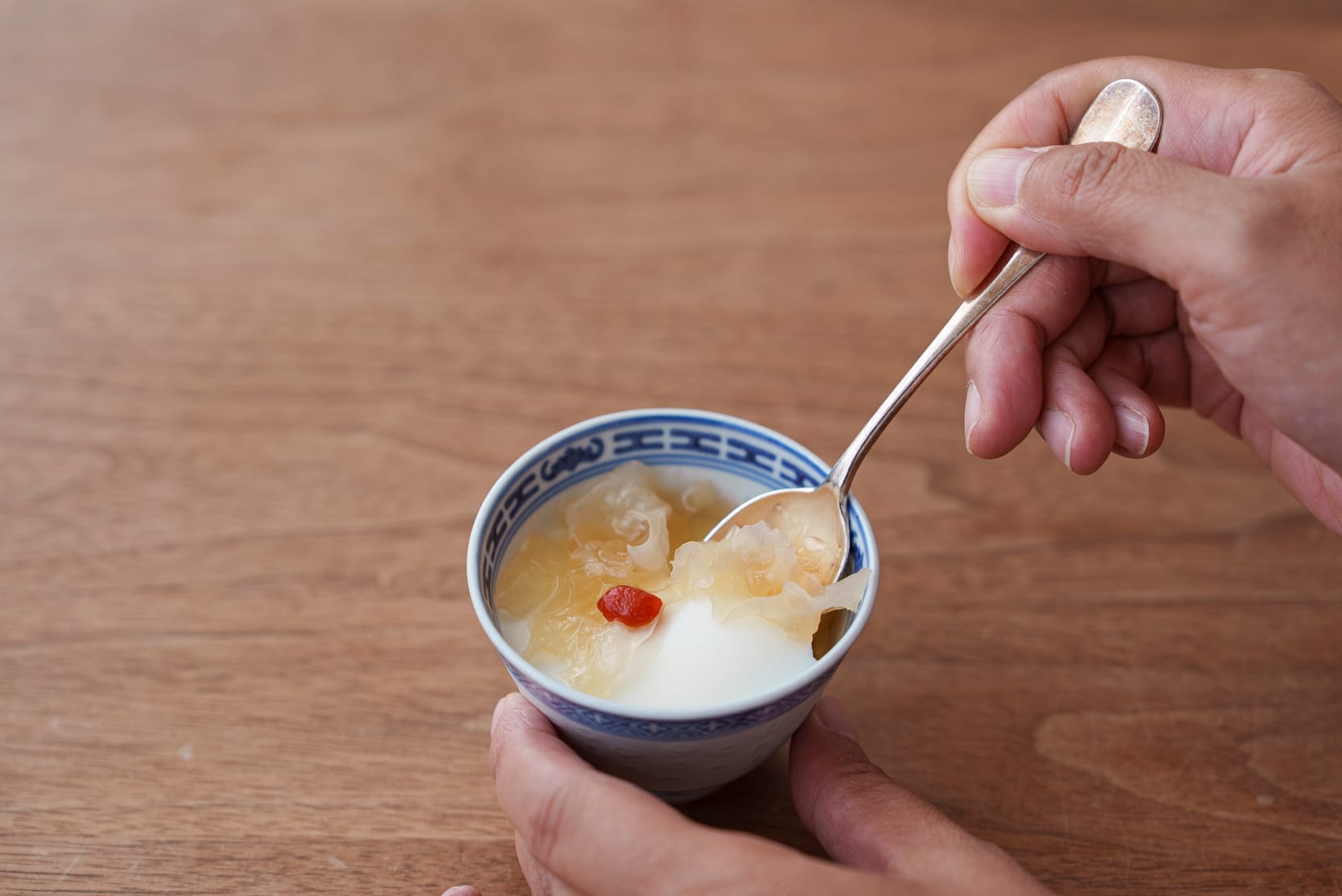 この日榎本さんが用意してくれた「白きくらげの杏仁豆腐」。肺を潤す食材の白きくらげと、ソースに発酵食品のみりんを使用している。