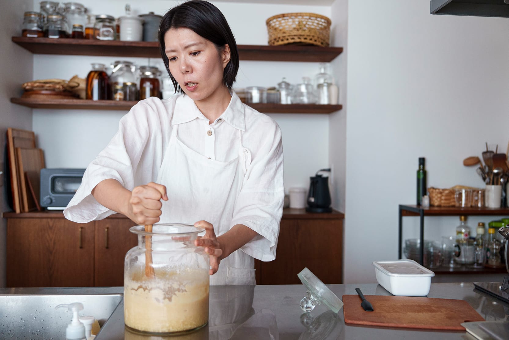「以前は夫とふたりでつくっていたのですが、子どもができたので、みんなで一斉にやってみようと思って。同じ場所で同じ材料、同じ分量でそれぞれにつくるんですけれど、食べ比べてみると全部違う味わいになるんですよね。夫は手が温かいので発酵が早いのかな? とか、子どもはまだ小さいから何か特別ないい菌がいるのかな? とか、いろいろ考えてみると、発酵って本当に不思議でおもしろいですよね」