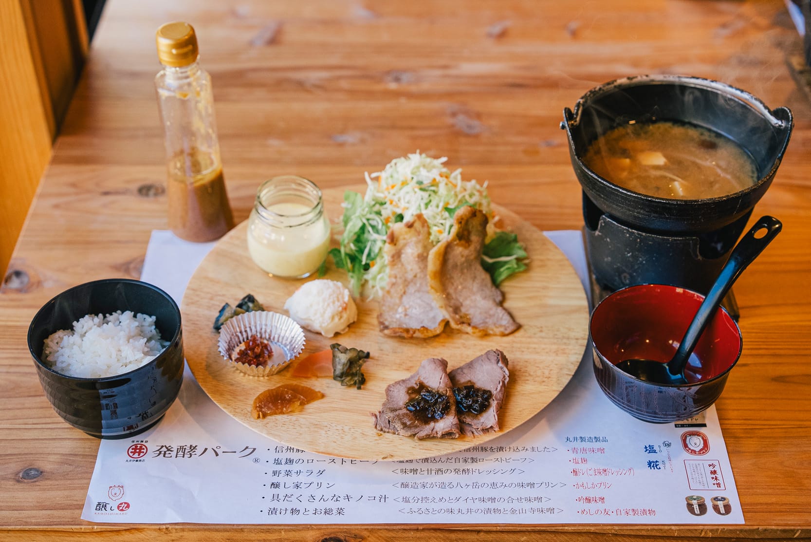 メニューにはすべて、自社製造の麹や味噌、甘酒などが使用されています。この日の「発酵プレート」のお品書きは、信州豚の青唐味噌焼き、塩麹のローストビーフ、野菜サラダ、具だくさんなキノコ汁、漬物、金山寺味噌、「醸し家プリン」など。サラダのドレッシングには味噌と甘酒が使われていたり、豚やローストビーフは麹で漬け込んでいたり。発酵尽くしの料理で、ボリュームもたっぷりです。