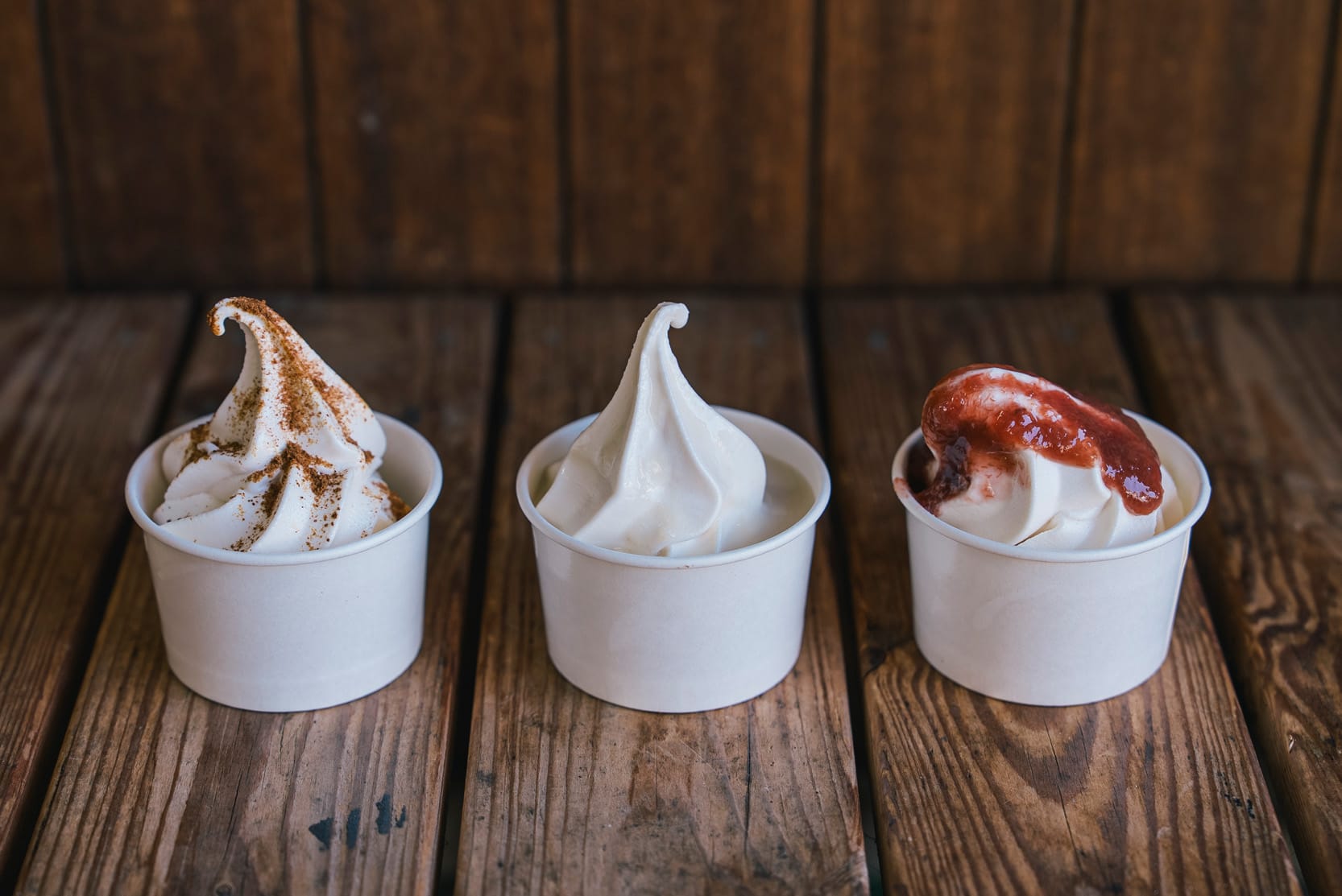 左から「味噌ソフト」「どぶろくソフト」「ルバーブソフト」