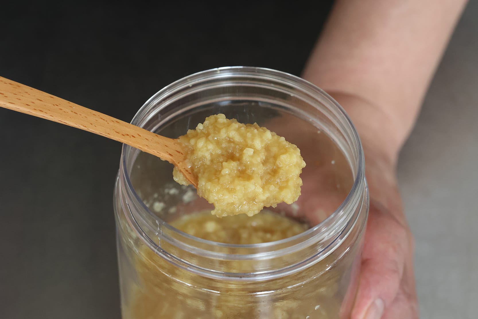 にんにく麹に使用する米麹は、蒸した米に麹菌を生育させたもの。この米麹に水を加えて室温で置くと酵素の一つであるアミラーゼが動き出し、米麹の米の形がなくなるほど分解し、米のデンプンが糖(ブドウ糖や麦芽糖)に変わります。また、麹菌にはタンパク質分解酵素であるプロテアーゼが含まれており、にんにく麹に肉や魚を漬けると、肉や魚の一部が分解され、素材がやわらかくなります。