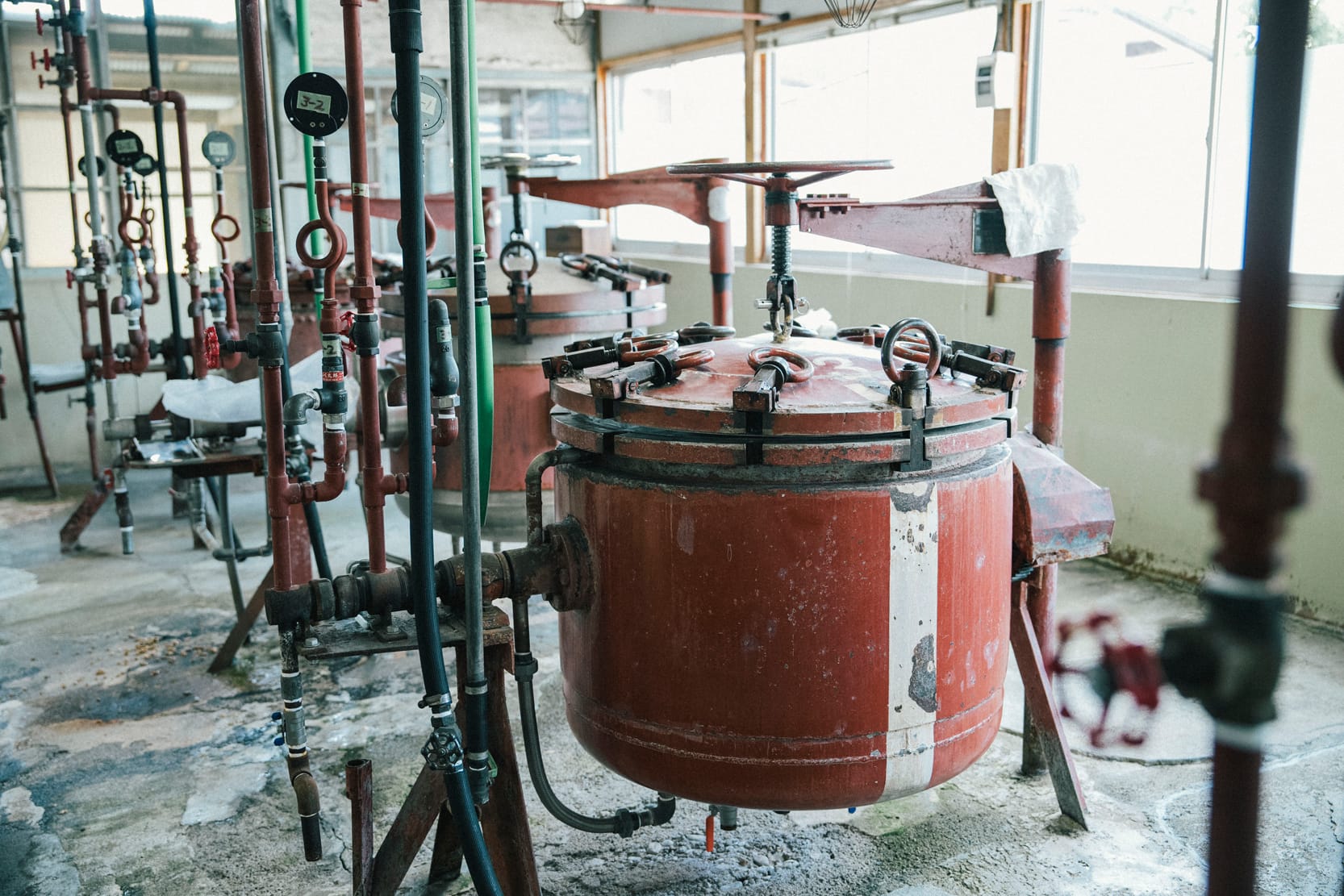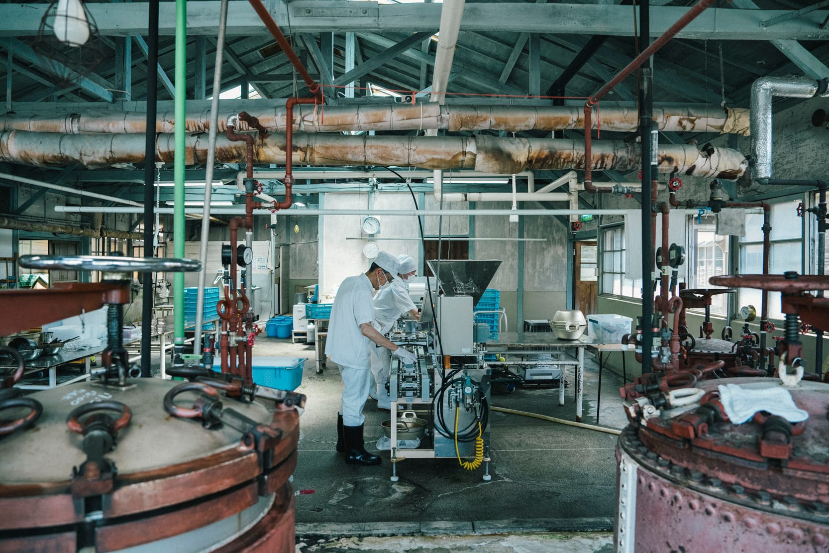 大豆を蒸す昭和28年製の「回転蒸缶」は今も現役。“宮城野式”と銘打たれており、納豆の大量生産の礎を築いた。