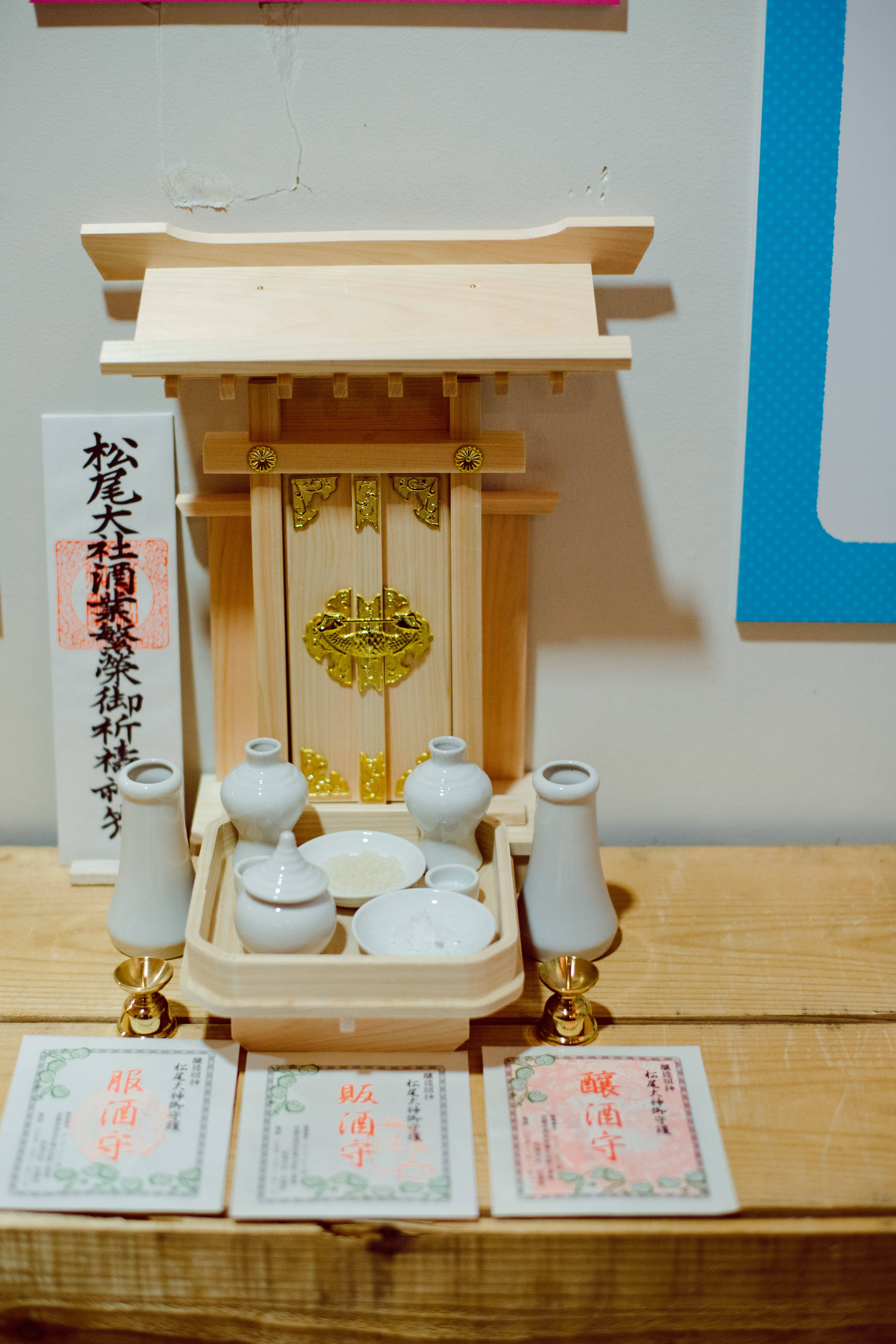 「これは京都で一番の歴史ある神社〈松尾大社〉の醸造の神様です。そのお守りは「酒を醸すお守り」と「酒を造るお守り」と「酒を飲むお守り」の3つ。酒にまつわる全ての人を守る芸の細かさに、みつけたときは興奮しました。