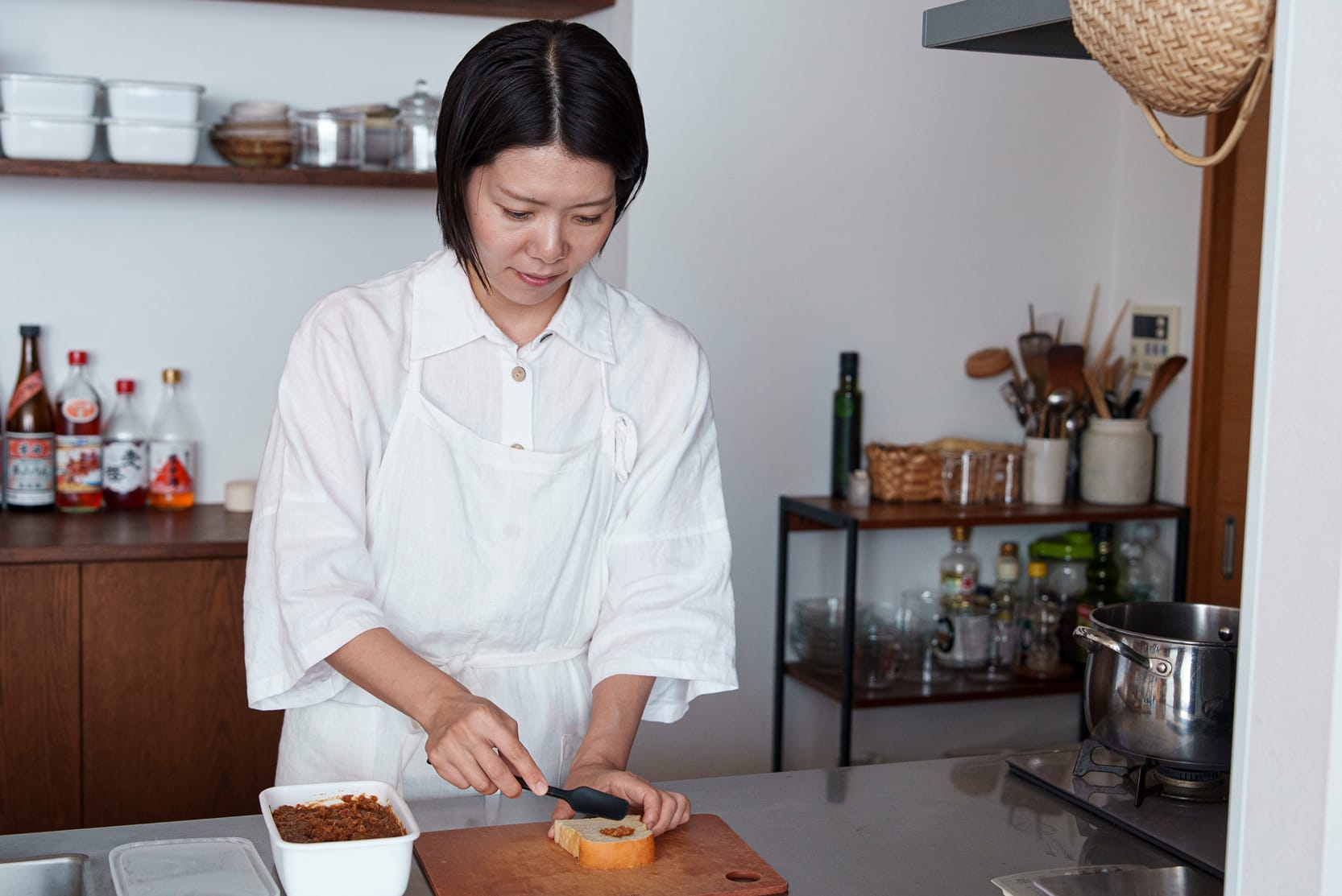 榎本さんのキッチンの棚には、大小さまざまな形の瓶がずらりと並んでいる。その中身の多くは、手づくりの発酵食品だ。現在はかなりの発酵マニアに違いない榎本さんだが、昔は食べることに興味はあったけれど、そんなに料理好きだったわけではなく、子ども時代の友人たちには今の仕事の話をするとびっくりされるという。発酵食品に目覚めたのも料理家になってからだった。榎本さんが料理に向き合うようになったのは大学生の頃、家族が忙しかったことがきっかけだった。