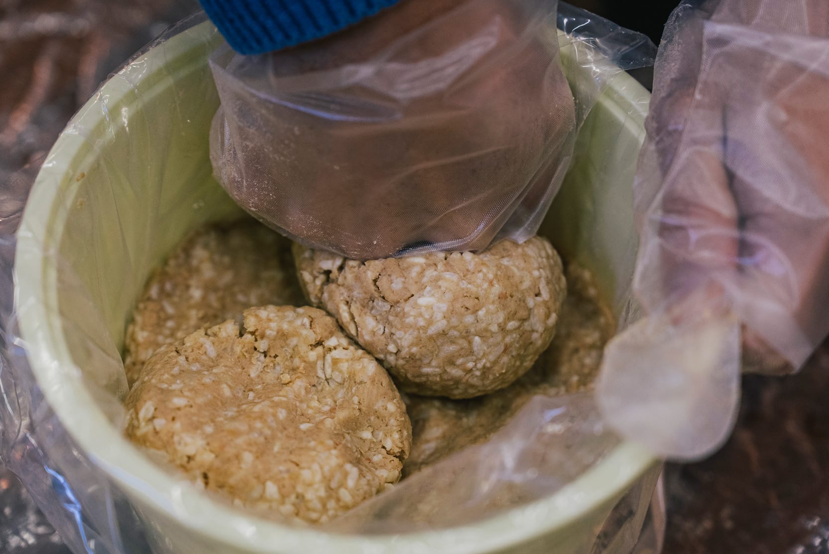 塩と米麹をよく混ぜて、あらかじめ用意してある蒸してつぶした大豆を加えて酵母をかけたら、テニスボールくらいに丸めて、樽の中にぎゅっと敷き詰めます。酵母は信州味噌蔵に伝わる独自の酵母で、これを加えることで仕上りの味噌の風味が格段に増すんだそうです。