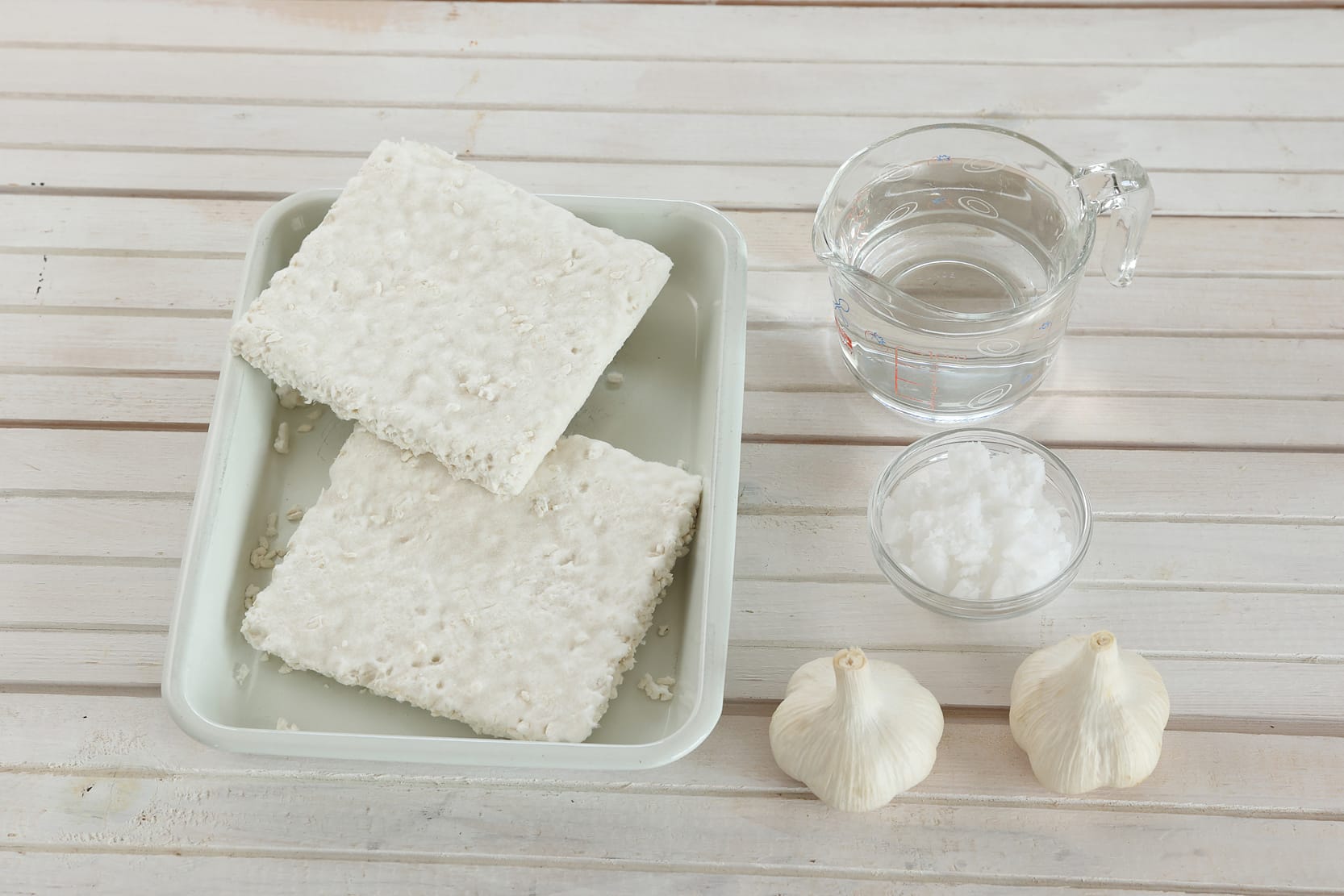 にんにく麹に使用する米麹は、蒸した米に麹菌を生育させたもの。この米麹に水を加えて室温で置くと酵素の一つであるアミラーゼが動き出し、米麹の米の形がなくなるほど分解し、米のデンプンが糖(ブドウ糖や麦芽糖)に変わります。また、麹菌にはタンパク質分解酵素であるプロテアーゼが含まれており、にんにく麹に肉や魚を漬けると、肉や魚の一部が分解され、素材がやわらかくなります。