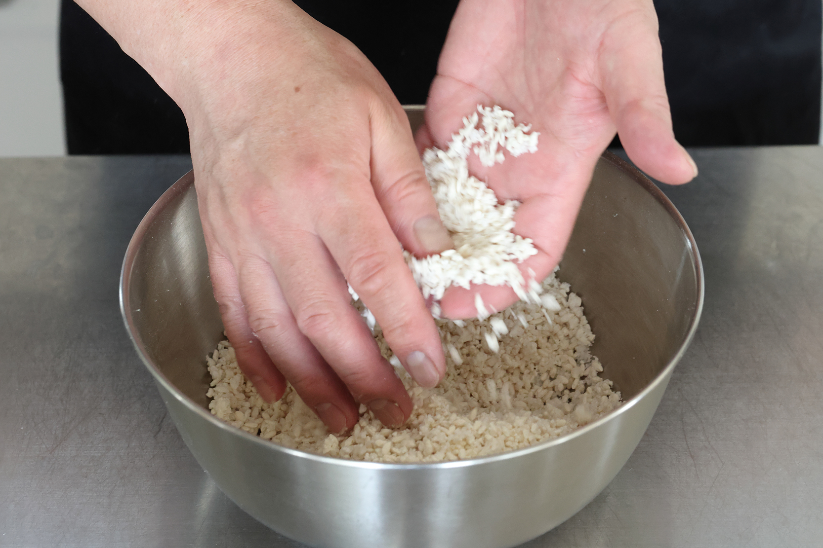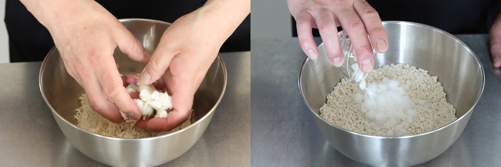 ボウルに乾燥麴を手でほぐし入れ、塩を加えて混ぜ合わせる。