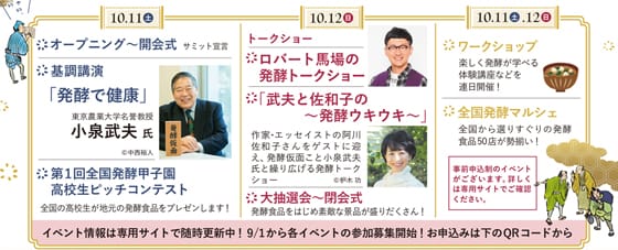 12日(日)11時からは芸人であり料理人でもある、ロバート・馬場裕之さんをゲストに「ロバート馬場の発酵トークショー」(事前申込制)、13時半からは「武夫と佐和子の〜発酵ウキウキ〜」(事前申込制)と題したトークショーも。作家・エッセイストの阿川佐和子さんをゲストに、小泉武夫さんと日々の食生活での発酵食品の取り入れ方や、国内外の珍しい発酵食品の紹介など、うきうきする発酵トークが予定されています。